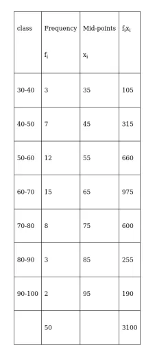 Therefore, $\overline{\mathrm{X}}=\frac{\sum_{\mathrm{i}=1}^{7} \mathrm{f}_{\mathrm{i}} \mathrm{x}_{\mathrm{i}}}{\sum_{\mathrm{i}=1}^{7} \mathrm{f}_{\mathrm{i}}}=\frac{3100}{50}=62$