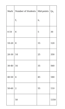 Therefore, $\overline{\mathrm{X}}=\frac{\sum_{\mathrm{i}=1}^{6} \mathrm{f}_{\mathrm{i}} \mathrm{x}_{\mathrm{i}}}{\sum_{\mathrm{i}=1}^{6} \mathrm{f}_{\mathrm{i}}}=\frac{1350}{50}=27$