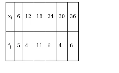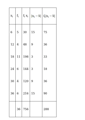 $\overline{\mathrm{x}}=\frac{\sum_{\mathrm{i}=1}^{6} \mathrm{f}_{\mathrm{i}}\left|\mathrm{x}_{\mathrm{i}}-\overline{\mathrm{x}}\right|}{\sum_{\mathrm{i}=1}^{6} \mathrm{f}_{\mathrm{i}}}=\frac{288}{36}=8$