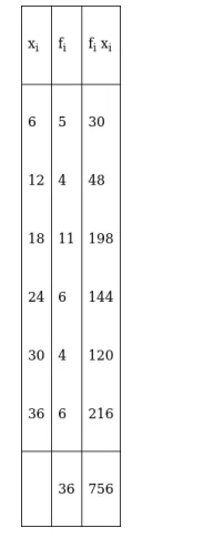 Therefore, $\overline{\mathrm{X}}=\frac{\sum_{\mathrm{i}=1}^{6} \mathrm{f}_{\mathrm{i}} \mathrm{x}_{\mathrm{i}}}{\sum_{\mathrm{i}=1}^{6} \mathrm{f}_{\mathrm{i}}}=\frac{756}{36}=21$