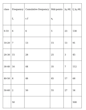 $\therefore \mathrm{M} . \mathrm{D}(\mathrm{M})=\frac{\sum_{\mathrm{i}=1}^{6} \mathrm{f}_{\mathrm{i}}\left|\mathrm{x}_{\mathrm{i}}-\mathrm{M}\right|}{\sum_{\mathrm{i}=1}^{6} \mathrm{f}_{\mathrm{i}}}$