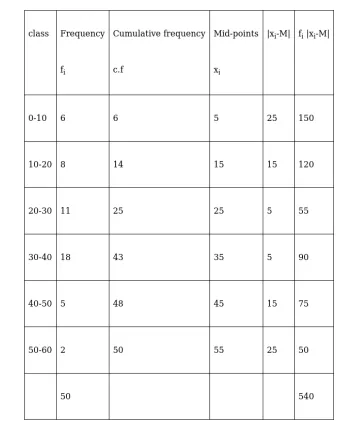 $\therefore \mathrm{M} . \mathrm{D}(\mathrm{M})=\frac{\sum_{\mathrm{i}=1}^{6} \mathrm{f}_{\mathrm{i}}\left|\mathrm{x}_{\mathrm{i}}-\mathrm{M}\right|}{\sum_{\mathrm{i}=1}^{6} \mathrm{f}_{\mathrm{i}}}$