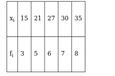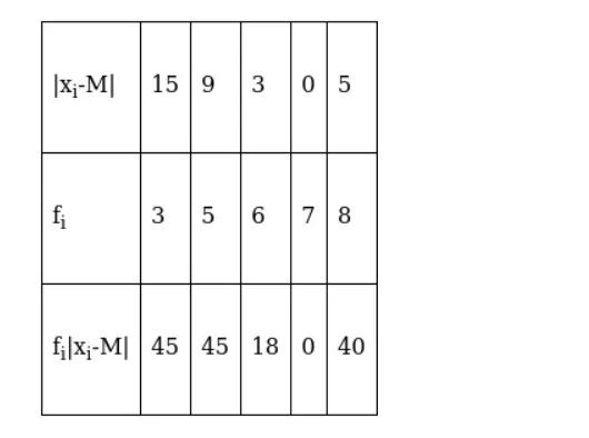 $\therefore \mathrm{M} . \mathrm{D}(\mathrm{M})=\frac{\sum_{\mathrm{i}=1}^{5} \mathrm{f}_{\mathrm{i}}\left|\mathrm{x}_{\mathrm{i}}-\mathrm{M}\right|}{\sum_{\mathrm{i}=1}^{5} \mathrm{f}_{\mathrm{i}}}$