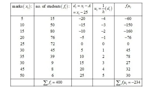 Now, we have $N=\sum f_{i}=400, \sum f_{i} u_{i}=-234, h=5$ and $A=25$.