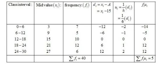 Now, we have $N=\sum f_{i}=40, \sum f_{i} u_{i}=5, h=6$ and $A=15$.