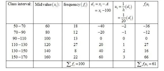Now we have $N=\sum f_{i}=100, \sum f_{i} u_{i}=61, h=20$ and $A=100$