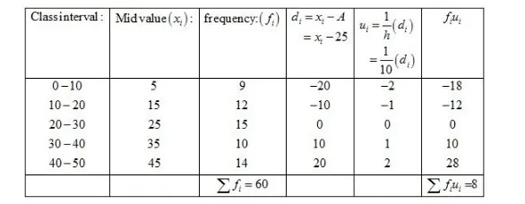 Now, we have $N=\sum f_{i}=60, \sum f_{i} u_{i}=8, h=10$ and $A=25$.