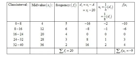 Now, we have $N=\sum f_{i}=20, \sum f_{i} u_{i}=-9, h=8$ and $A=20$.