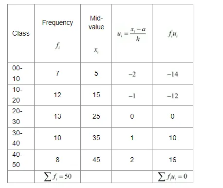 $\operatorname{Mean}(\bar{x})=a+\frac{\sum f_{t} u_{i}}{\sum f_{i}} \times h$