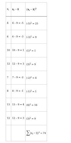 Variance, $\sigma^{2}=\frac{\sum\left(\mathrm{x}_{\mathrm{i}}-\overline{\mathrm{x}}\right)^{2}}{\mathrm{n}}$