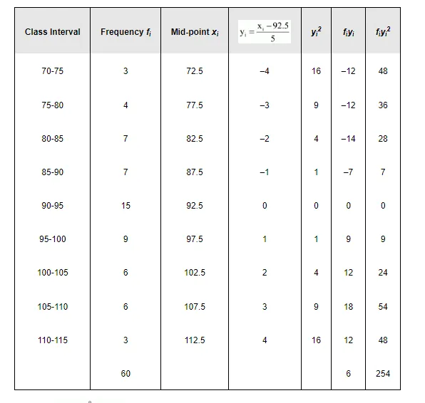 Mean, $\bar{x}=\mathrm{A}+\frac{\sum_{i=1}^{9} \mathrm{f}_{i} \mathrm{y}_{i}}{\mathrm{~N}} \times \mathrm{h}=92.5+\frac{6}{60} \times 5=92.5+0.5=93$