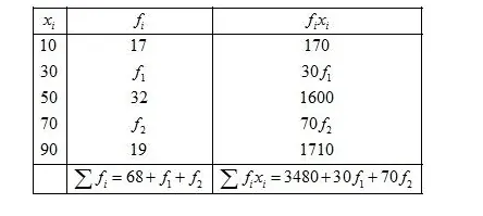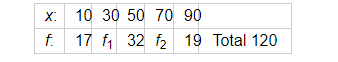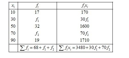 Find the missing frequencies in the following frequency distribution if it is known that the mean of the distribution is 50.