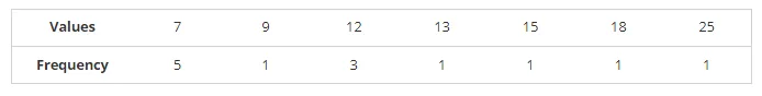 Since maximum frequency 5 corresponds to the value 7 then mode = 7