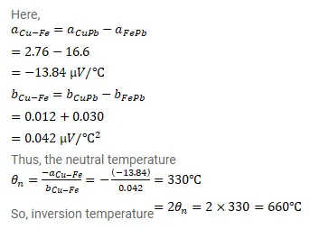 Find the neutral temperature and inversion temperature of copper-iron thermocouple if the reference junction is kept at $0^{\circ} \mathrm{C} .$ Use the data in table (33.1).