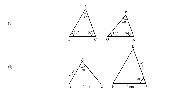 Find the pair of similar triangles among the given pairs. State the similarity criterion and write the similarity relation in symbolic form.