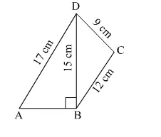 Find the perimeter and area of a quadrilateral ABCD in which BC = 12 cm, CD = 9 cm, BD = 15 cm, DA = 17 cm and ∠ABD = 90°.