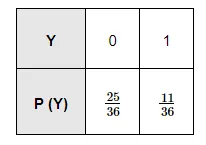 $P(Y=1)=P$ (six appears on at least one of the dice) $=\frac{1}{6} \times \frac{5}{6}+\frac{5}{6} \times \frac{1}{6}+\frac{1}{6} \times \frac{1}{6}=\frac{11}{36}$