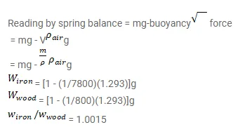 Find the ratio of the weights, as measured by a spring balance, of a $1 \mathrm{~kg}$ block of iron and a $1 \mathrm{~kg}$ block of wood. Density of iron $=7800 \mathrm{~kg} / \mathrm{m}^{3}$, density of wood $=800 \mathrm{~kg} / \mathrm{m}^{3}$ and density of air $=1.293 \mathrm{~kg} / \mathrm{m}^{3}$.