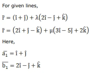 $\overrightarrow{\mathrm{r}}=(2 \hat{\mathrm{i}}+\hat{\mathrm{j}}-\hat{\mathrm{k}})+\mu(3 \hat{\mathrm{i}}-5 \hat{\mathrm{j}}+2 \hat{\mathrm{k}})$