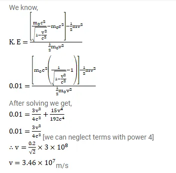 Find the speed at which the kinetic energy of a particle will differ by $1 \%$ from its nonrelativistic value ${ }^{\frac{1}{2}} \mathrm{~m}_{0} \mathrm{v}^{2}$.