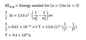 Find the temperature at which the average thermal kinetic energy is equal to the energy needed to take a hydrogen atom from its ground state to $\mathrm{n}=3$ state. Hydrogen can now emit red light of wavelength $653.1 \mathrm{~nm}$. Because of Maxwellian distribution of speeds, a hydrogen sample emits red light at temperatures much lower than that obtained from this problem. Assume that hydrogen molecules dissociate into atoms.