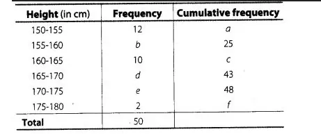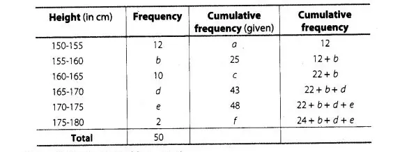 Find the unknown entries o, b, c, d, e and f in the following distribution of heights of students in a class