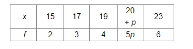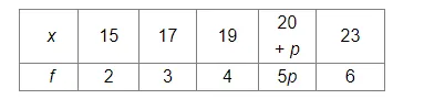 Mean $=\frac{(15 \times 2)+(17 \times 3)+(19 \times 4)+((20+p) \times 5 p)+(23 \times 6)}{2+3+4+5 p+6}$