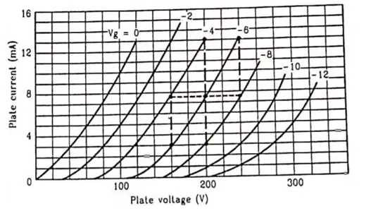 Find the values of $r_{p}, \mu$ and $g_{m}$ of a triode operating at plate voltage $200 \mathrm{~V}$ and grid voltage $-6 \mathrm{~V}$. The plate characteristics as shown in figure.