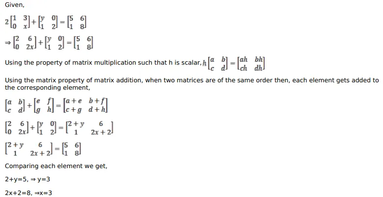 $2\left[\begin{array}{ll}1 & 3 \\ 0 & \mathrm{x}\end{array}\right]+\left[\begin{array}{ll}\mathrm{y} & 0 \\ 1 & 2\end{array}\right]=\left[\begin{array}{ll}5 & 6 \\ 1 & 8\end{array}\right]$
