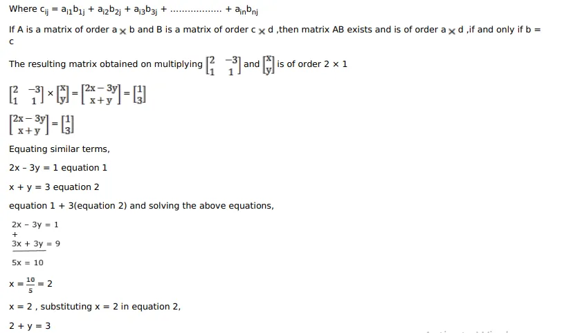 Given : $\left[\begin{array}{cc}2 & -3 \\ 1 & 1\end{array}\right]\left[\begin{array}{l}x \\ y\end{array}\right]=\left[\begin{array}{l}1 \\ 3\end{array}\right]$