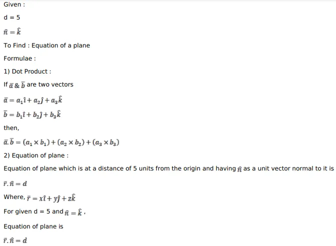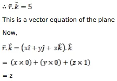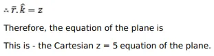 Find the vector and Cartesian equations of a plane which is at a distance of 5 units from the origin and which has $\hat{k}$ as the unit vector normal to it.