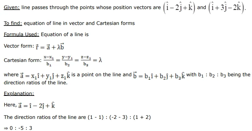 Find the vector and Cartesian equations of the line joining the points whose position vectors are $(\hat{\mathrm{i}}-2 \hat{\mathrm{j}}+\hat{\mathrm{k}})$ and $(\hat{\mathrm{i}}+3 \hat{\mathrm{j}}-2 \hat{\mathrm{k}})$