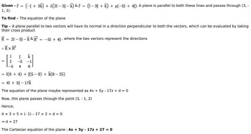 Find the vector and Cartesian equations of the plane passing through the point $(3,-1,2)$ and parallel to the linesĀ