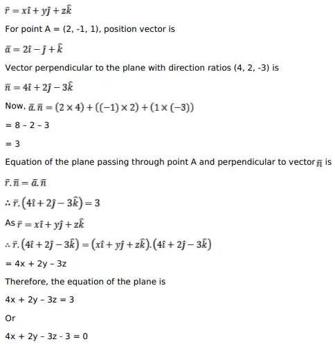 Find the vector and Cartesian equations of the plane passing through the point $(2,-1,1)$ and perpendicular to the line having direction ratios $4,2,-3$.