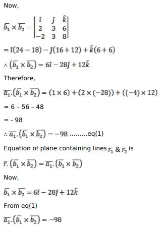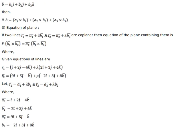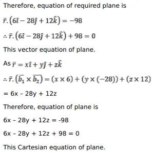 Find the vector and Cartesian forms of the equations of the plane containing the two lines $\bar{r}=(\hat{i}+2 \hat{j}-4 \hat{k})+\lambda(2 \hat{i}+3 \hat{j}+6 \hat{k})$ and $\bar{r}=(9 \hat{i}+5 \hat{j}-\hat{k})+\mu(-2 \hat{i}+3 \hat{j}+8 \hat{k}) \ldots$