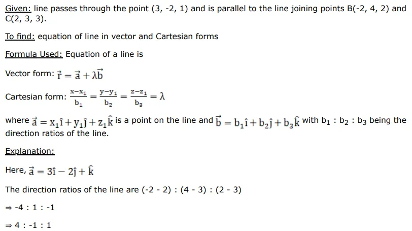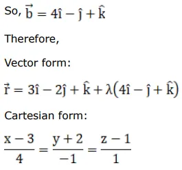 Find the vector equation of a line passing through the point $A(3,-2,1)$ and parallel to the line joining the points $B(-2,4,2)$ and $C(2,3,3)$. Also, find the Cartesian equations of the line.