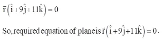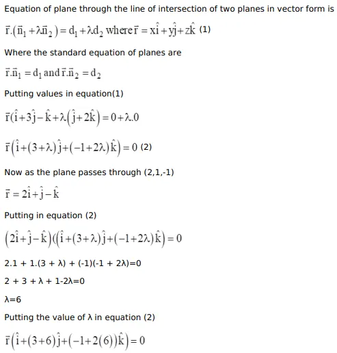 Find the vector equation of the plane through the intersection of the planes $\overrightarrow{\mathrm{r}} \cdot(\hat{\mathrm{i}}+3 \hat{\mathrm{j}}-\hat{\mathrm{k}})=0$ and $\overrightarrow{\mathrm{r}} \cdot(\hat{\mathrm{j}}+2 \hat{\mathrm{k}})=0$. and passing through the point $(2,1,-1)$