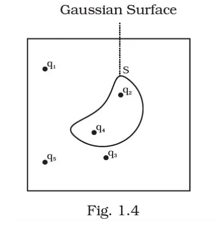 Five charges q1, q2, q3, q4, and q5 are fixed at their positions as shown in Fig. 1.4. S is a Gaussian surface.