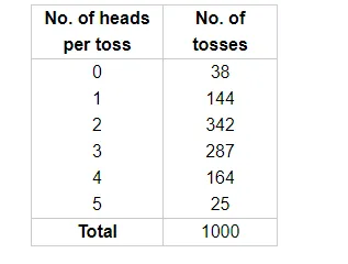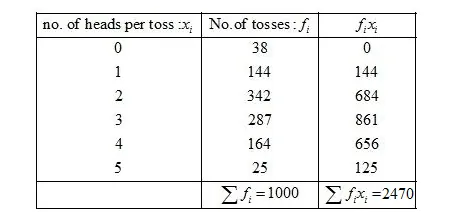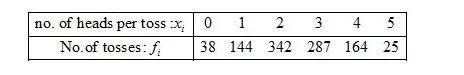 First of all prepare the frequency table in such a way that its first column consist of the numnber of heads per tosses $\left(x_{i}\right)$ and the second column the corresponding number of tosses $\left(f_{i}\right)$.