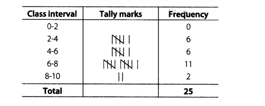 6, .8, 7, 7, 6, 5, 3, 2, 5, 6, 8, 7, 7, 4, 3, 6, 6,6, 7, 5, 4, 3, 3, 2, 5 Prepare a frequency distribution table for the data using class intervals 0-2, 2-4 etc.