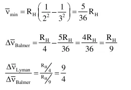 For any given series of spectral lines of atomic hydrogen, let $\Delta \bar{v}=\bar{v}_{\max }-\bar{v}_{\min }$ be the difference in maximum and minimum frequencies in $\mathrm{cm}^{-1}$. The ratio $\Delta \bar{v}_{\text {Lyman }} / \Delta \bar{v}_{\text {Balmer }}$ is :