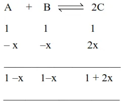 $\mathrm{K}=\frac{[\mathrm{C}]_{\mathrm{eq}}^{2}}{[\mathrm{~A}]_{\mathrm{eq}}[\mathrm{B}]_{\mathrm{eq}}}=\frac{(1+2 \mathrm{x})^{2}}{(1-\mathrm{x})(1-\mathrm{x})}$