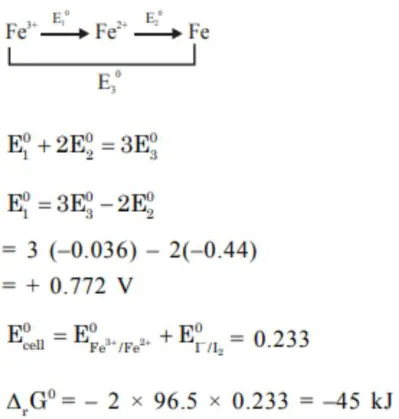 For the reaction $2 \mathrm{Fe}^{3+}(\mathrm{aq})+2 \mathrm{I}^{-}(\mathrm{aq}) \rightarrow 2 \mathrm{Fe}^{2+}(\mathrm{aq})+\mathrm{I}_{2}(\mathrm{~s})$ the magnitude of the standard molar free energy change, $\Delta_{\mathrm{r}} \mathrm{G}_{\mathrm{m}}^{\circ}=-_{\mathrm{kJ}} \mathrm{J}$ (Round off to the Nearest Integer).