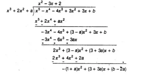 Given that the zeroes of q(x) = x3 + 2x2 + a are also the zeroes of the polynomial p(x) = x5 – x4 – 4x3 + 3xz + 3x + b i.e., q(x) is a factor of p(x). Then, we use a division algorithm.