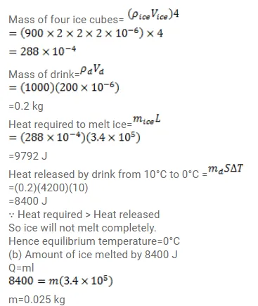 (b) If the ice cubes do not melt completely, find the amount melted. Assume that no heat is lost to the outside of the drink and that the container has negligible heat capacity. Density of ice $=900 \mathrm{~kg} / \mathrm{m}^{3}$, density of the drink=1000kg $/ m^{3}$, specific heat capacity of the drink $=4200 \mathrm{~J} / \mathrm{kg}-\mathrm{K}$, latent heat of fusion of ice $=3.4 \times 10^{5} \mathrm{~J} / \mathrm{kg}$.