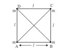 Four equal masses, m each are placed at the corners of a square of length (l) as shown in the figure.