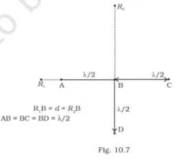 Four identical monochromatic sources A, B, C, D as shown in the figure produce waves of the same wavelength λ and are coherent. Two receiver R1 and R2 are at great but equal distances from B.