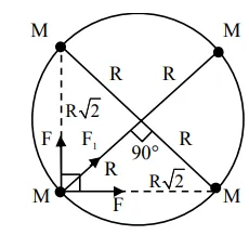 $\sqrt{2} \frac{\mathrm{GMM}}{(\sqrt{2} \mathrm{R})^{2}}+\frac{\mathrm{GMM}}{(2 \mathrm{R})^{2}}=\frac{\mathrm{MV}^{2}}{\mathrm{R}}$