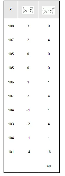 $\operatorname{Variance}\left(\sigma_{2}^{2}\right)=\frac{1}{N} \sum_{i=1}^{10}\left(y_{i}-\bar{y}\right)^{2}=\frac{1}{10} \times 40=4$