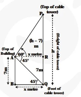From the top of a 7 m high building, the angle of elevation of the top of a cable tower is 60° and the angle of depression of its foot is 45°. Determine the height of the tower.